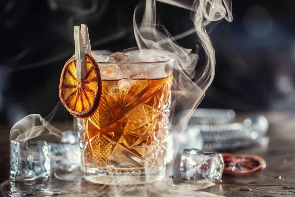 Spearsong Whisky, mezcal, and cold brew coffee, mixed with orange bitters, angostura bitters and honey syrup. Add ingredients over ice and stir to serve, with orange peel to garnish.