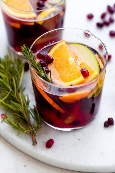 Black tea base with fresh-squeezed orange juice, berry juice, and pomegranate juice! And it's not Sangria without bits of fruit soaking in it in Dionysian bliss.