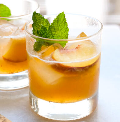 Spearsong, muddled with peach, lemon, and maple syrup, with a sprig of mint to garnish. Probably won't lead to productive study habits, but it will make you feel clever!