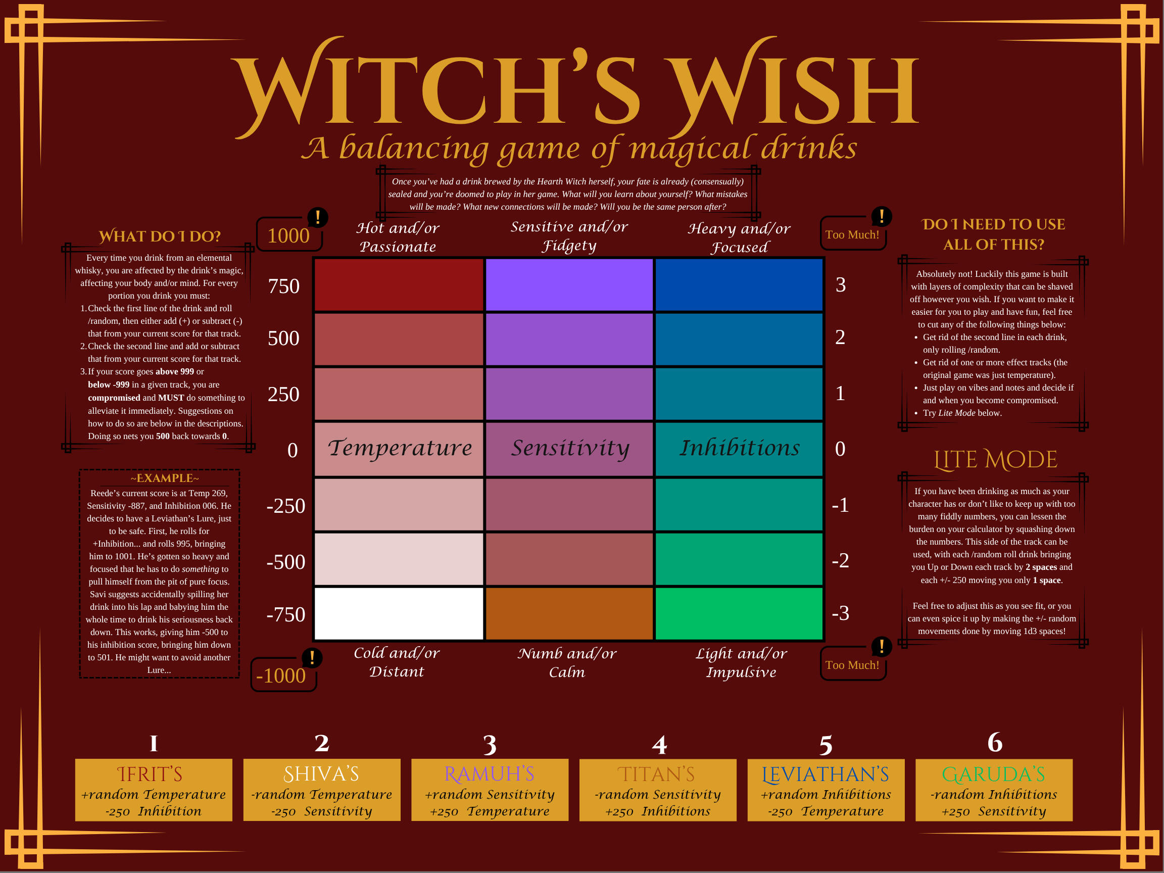 When drinking Spearsong's elemental whiskies, one should keep track of how the building combination of alchemy and spellcraft affect the body. These come in THREE tracks to keep up with: Temperature, Sensitivity, and Inhibitions. The effects of each track manifest as physical or mental and you are free to do either or both of them!