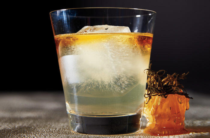 Spearsong Whisky, mezcal, and cold brew coffee, mixed with orange bitters, angostura bitters and honey syrup. Add ingredients over ice and stir to serve, with orange peel to garnish.